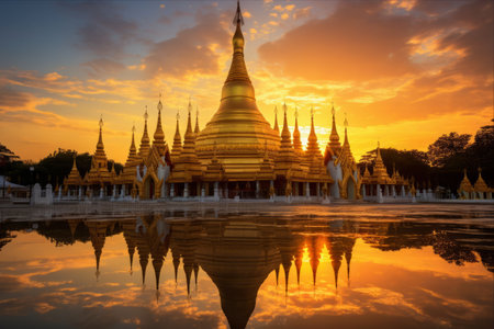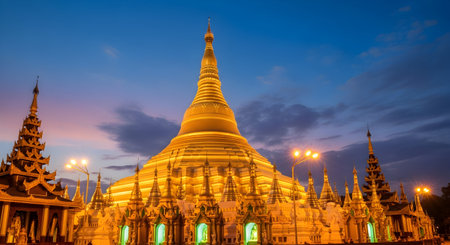 Shwedagon Pagoda Temple shining in the beautiful sunset in Yangon, Myanmar.