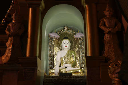 Night shot of stucco buddha statue decorated in golden be enshrined inside the arch at Shwedagon Pagoda, Yangon Myanmar.