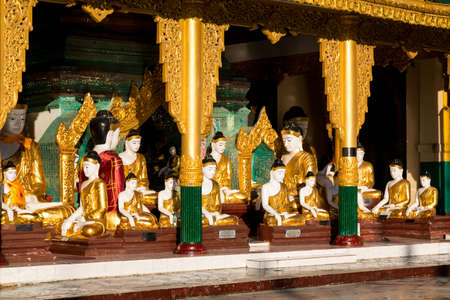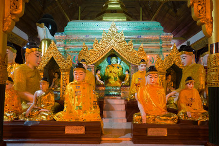 YANGON, MYANMAR - DECEMBER 17, 2016: Sculptures of a seated Buddha in one of their sanctuaries of the Shwedagon Pagoda in the night illumination