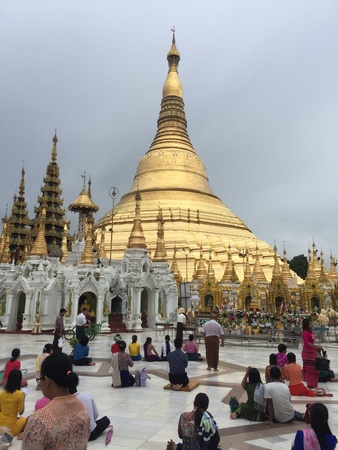 The biggest Buddhist temple Shwedagon pagoda with praying Buddhist people, Rangoon, Burma.