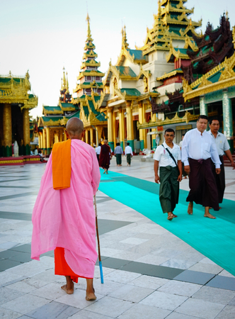 Yangon, Myanmar - Oct 16, 2015. An old nun walking at Shwedagon Paya in Yangon, Myanmar. Shwedagon is the famous sacred place and tourist attraction landmark in Yangon, Myanmar.