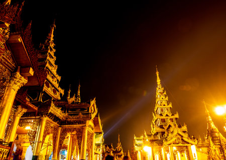 Shwedagon Pagoda Temple shining in the beautiful sunset in Yangon, Myanmar (Burma) the beautiful golden pagoda, the oldest historical pagoda in Burma and the world, in the evening with great evening light.