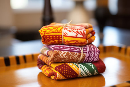 A colorful array of African textiles neatly folded in a pile