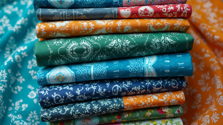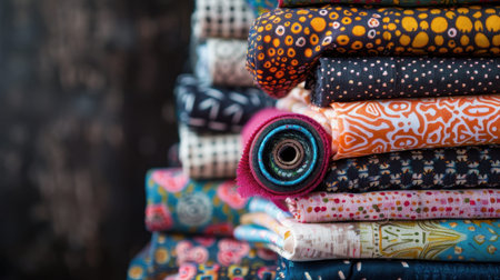 Colorful rolls of fabric arranged closely, showcasing various intricate patterns and vibrant hues. Textile shop setting with warm natural lighting. Concept of fashion design, crafts, home decor.