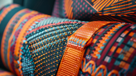 Intricate fabric pattern with vibrant colors displayed in a close-up shot