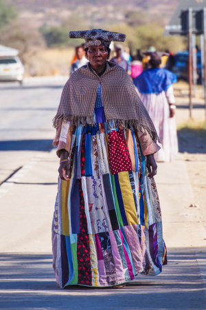 Opuwo, Namibia - Jul 07, 2019: Herero Woman in traditional clothes in Opuwo. Namibia. The Herero belonging to the Bantu group, with about 240,000 members alive today.