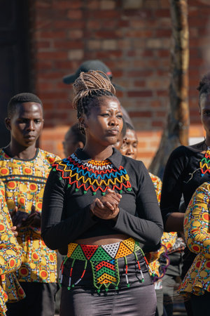 African woman in traditional attire with colorful beaded necklace and waistband. South African cultural representation and celebration. South Africa - 21 OCT 2023