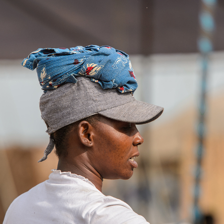 OUIDAH, BENIN - Jan 10, 2017: Unidentified Beninese woman in shirt and a cap looks ahead at the voodoo festival, which is anually celebrated on January, 10th.