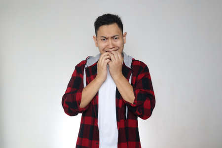 Portrait of young funny Asian man biting his nails as if he is worried afraid of something bad