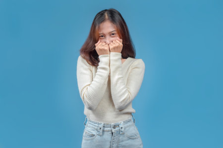 An Indonesian woman with a shy, playful expression, hands covering part of her face, wearing a cream sweater and jeans against a blue background, conveying charm and youthful warmth.