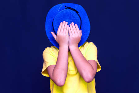 Close up of upset sun burned kid boy crying face hidden under blue hat