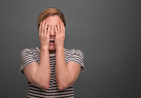 Young woman hides her face on a gray background.