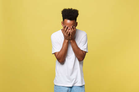 young man with hands covering eyes standing with isolated background. careless and afraid concept