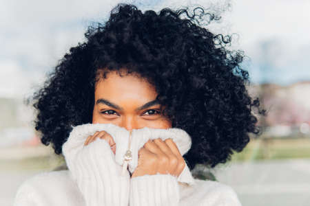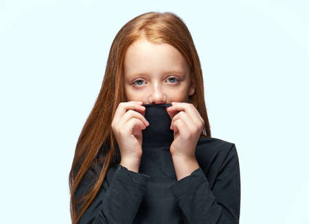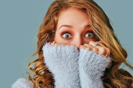 Displeased young afraid woman wearing a high neck sweater, hiding form problems.