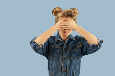 Afraid teenage girl who looks through her fingers. Teen girl covering face with hands isolated on blue background, copy space.