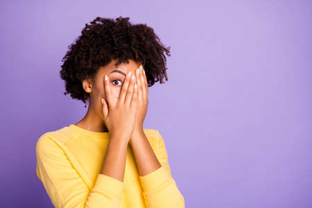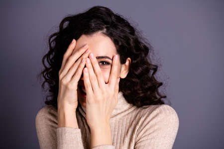 Close-up portrait of her she nice attractive charming lovely shy scared, wavy-haired girl closing hiding face peeking isolated over violet purple lilac pastel color background