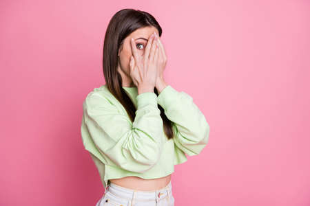 Photo of attractive funny lady closing eyes arms peeking glance wanna know secret curious person wear casual green crop sweatshirt pullover isolated pink pastel color background