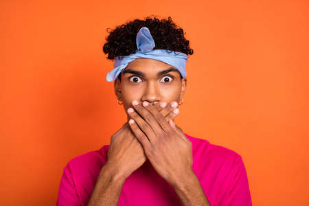 Photo portrait of guy in stylish outfit keeping secret shut mouth staring amazed isolated vibrant orange color background