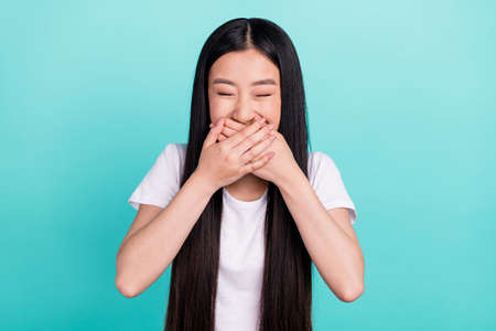 Portrait of attractive cheerful long-haired girl closing mouth laughing isolated over bright teal turquoise color background