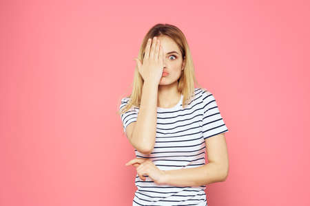 Cheerful woman striped t-shirt lifestyle emotions and gestures with hands pink background