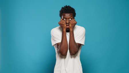 Portrait of frightened man having hands on mouth. Scared person feeling anxious and panicked in studio while looking at horror scene and scary movie. Afraid adult having terrified reaction