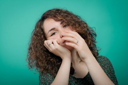 Stressed nervous scared young woman biting nails fingers, suffer from domestic violence or abuse, feel frightened