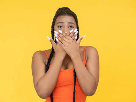 Racism discrimination. Human rights. Sexism problem. Speechless stressed African woman covering mouth in shock isolated on orange background.