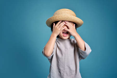 Happy asian little kid blocking face with both hand. Empty space in studio shot isolated on colorful blue background. Education concept for school.