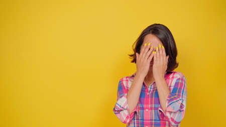 Portrait of a shy emotional girl on a yellow background. Charming woman expressing shyness covering face with face and peeping out. Facial expressions, emotions, feelings. High quality 4k footage.