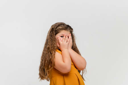 Scared. Happy, smiley little caucasian girl isolated on white studio background with copyspace for ad. Looks happy, cheerful. Childhood, education, human emotions, facial expression concept.
