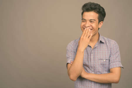 Portrait of young Asian businessman against gray background
