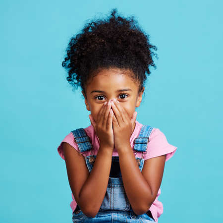 You didnt hear it from me. Shot of a little girl looking surprised while posing against a blue background.