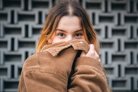 Portrait of a young woman on a blurred background of a city wall.