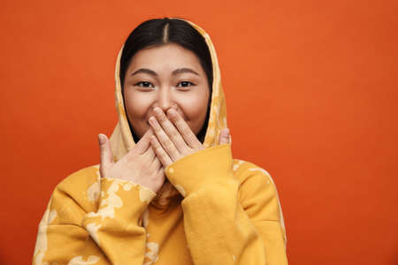 Asian teen girl wearing hoodie covering her mouth isolated over orange background
