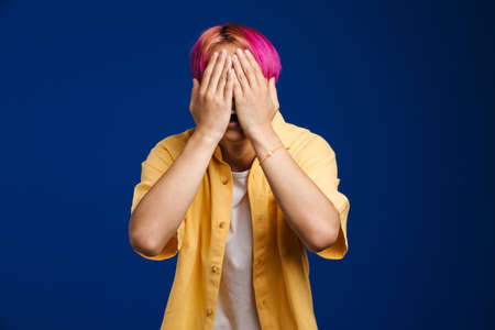 Asian boy with pink hair posing and covering his face isolated over blue background