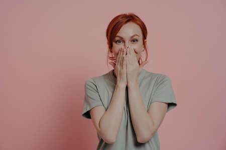 Excited happy red-haired woman covering mouth with hands and looking with surprised facial expression, laughing and waiting for surprise, trying to hide emotions, posing isolated on rosy background