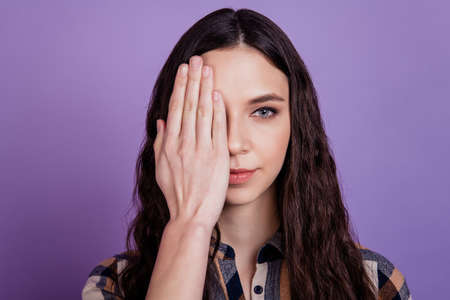 Close-up portrait of girl closing one eye checking eyesight vision isolated over violet color background