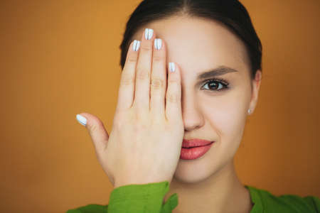 Young girl brunette woman covered her face with her hands isolated on gray background