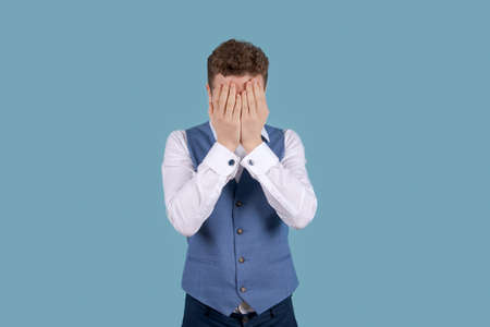Businessman in blue suit with sad expression, covering his face with his hands, crying. Stands on a blue background. Concept of depression and business failure