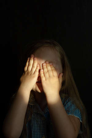 Red-haired young girl on black background in a gray T-shirt, hiding behind her hands, scared