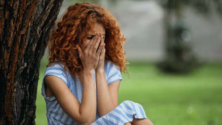 Woman with long red hair covering half of her face with the palm of her right hand. Portrait of a freckled young woman on a blue background