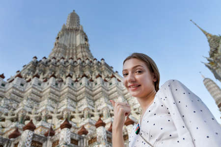 Woman traveler getting happy and excited while visiting Asian tourism landmark, Southeast Asian travel destination in post pandemic world