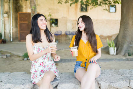 Hispanic young woman laughing because of her best friend's funny story. Beautiful women enjoying a coffee while catching up during the weekend