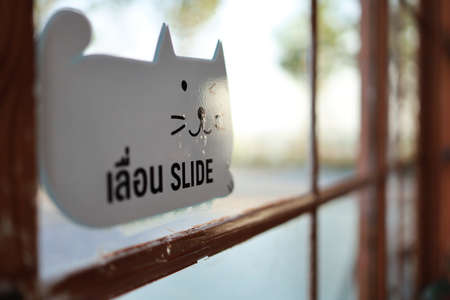 Close up of face young Asian woman smile through a glass wall