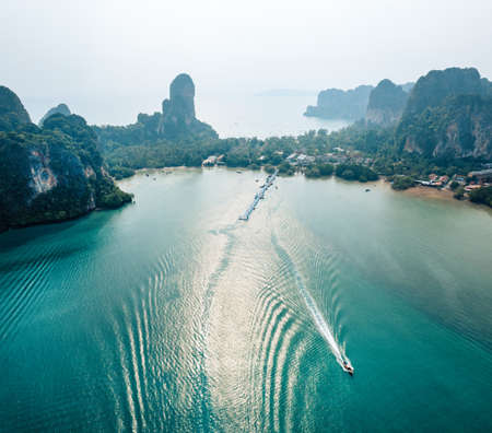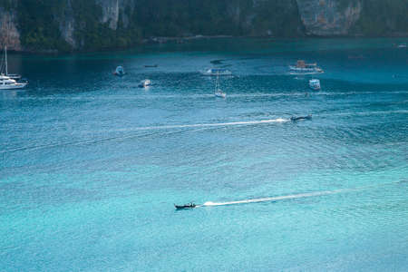 View of the island in Andaman sea with speedboat in a clear water, Thailand
