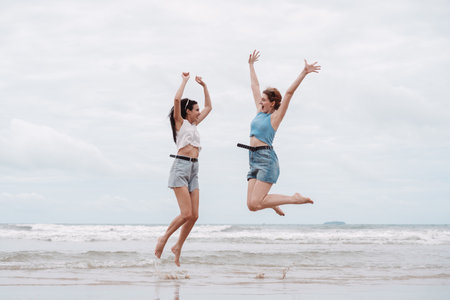 Two young women jumping with joy on the beach friendship, freedom, happiness, and summer fun. vacation, lifestyle, youthful energy, and beach holiday.