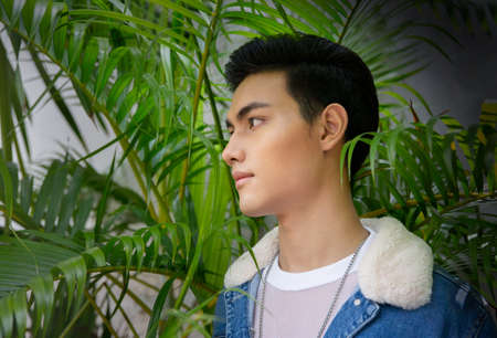 Handsome young man posing on vintage dark background. Portrait of satisfied Asian man against wall. Close up face of fashionable Asian man on wall background.