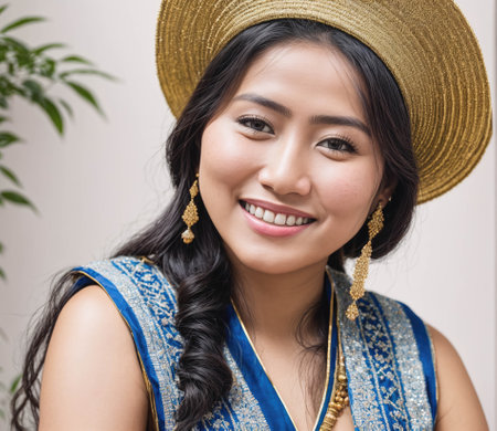 Portrait of a smiling Thai woman in modern traditional attire, with clean soft-focus background and delicate Thai patterns behind