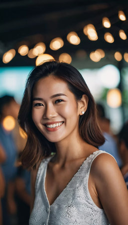 A cheerful woman in her twenties smiles brightly while surrounded by a vibrant atmosphere in Thailand. The warm ambiance and colorful lights create a joyful setting.