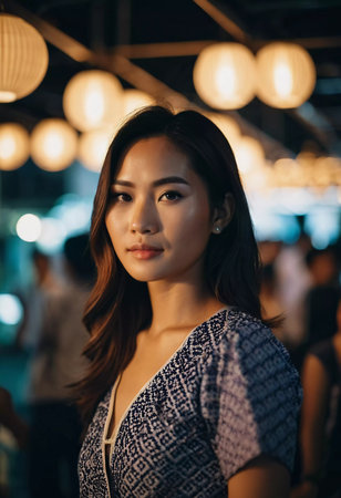 A resident woman of Thailand stands gracefully at an evening market, showcasing traditional attire.